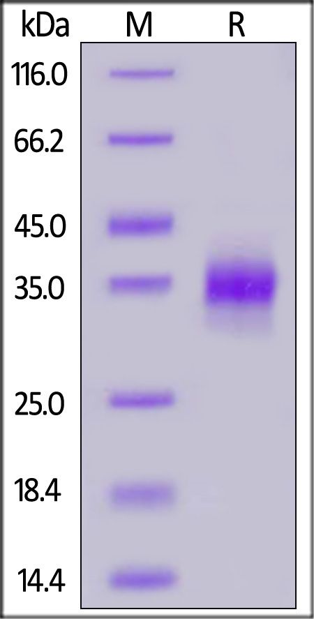 This protein carries a polyhistidine tag at the N-terminus. The protein has a calculated MW of 22.6 kDa. The protein migrates as 34-40 kDa under reducing (R) condition (SDS-PAGE) due to glycosylation.