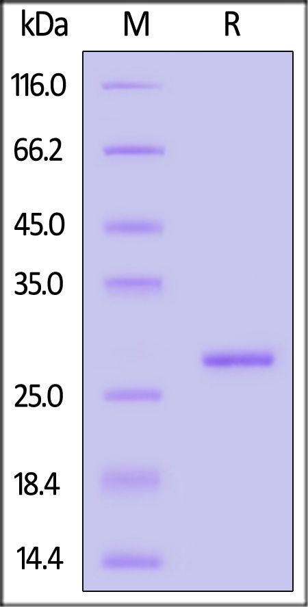 This protein carries a polyhistidine tag at the C-terminus, followed by an Avi tag (Avitag™). The protein has a calculated MW of 26.6 kDa. The protein migrates as 29 kDa when calibrated against Star Ribbon Pre-stained Protein Marker under reducing (R) condition (SDS-PAGE) due to glycosylation.