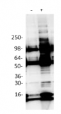 Fig 2: Cos-7 cells were either treated (+) or untreated (-) with TSA (1 ?M) and nicotinamide (1 mM) for 6 hours. Cell lysates were prepared in BlastR buffer and filter system and 1 mg of lysate per reaction was used for IP of acetylated proteins. 20 ml of AAC03 was used per IP reaction. Western blots of immunoprecipitated proteins were developed using AAC03-HRP at 1:3000 dilution. To see the full Immunoprecipitation comparison, see the Optimized Protocols or the product datasheet.