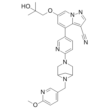 Smiles N#CC1=C2C(C3=CC=C(N4CC(C5)N(CC6=CC=C(OC)N=C6)C5C4)N=C3)=CC(OCC(C)(O)C)=CN2N=C1