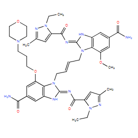 Smiles O1CCN(CC1)CCCOC1=CC(C(N)=O)=CC2=C1N(C(NC(C1=CC(C)=NN1CC)=O)=N2)C/C=C/CN1C(NC(C2=CC(C)=NN2CC)=O)=NC2C=C(C(N)=O)C=C(C1=2)OC