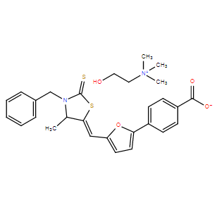 Smiles O=C([O-])C1=CC=C(C2=CC=C(/C=C(SC(N3CC4=CC=CC=C4)=S)/C3=O)O2)C=C1.OCC[N+](C)(C)C.[(Z)]