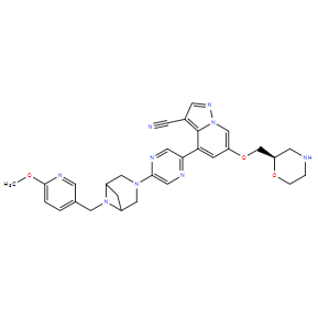 Smiles N#CC1=C2C(C3=NC=C(N4CC(C5)N(CC6=CC=C(OC)N=C6)C5C4)N=C3)=CC(OC[C@H]7CNCCO7)=CN2N=C1