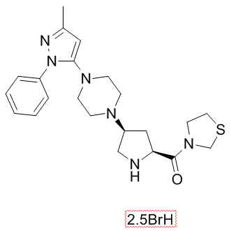 Smiles CC1=NN(C(=C1)N2CCN(CC2)[C@H]3C[C@H](NC3)C(=O)N4CCSC4)C5=CC=CC=C5.CC1=NN(C(=C1)N2CCN(CC2)[C@H]3C[C@H](NC3)C(=O)N4CCSC4)C5=CC=CC=C5.Br.Br.Br.Br.Br