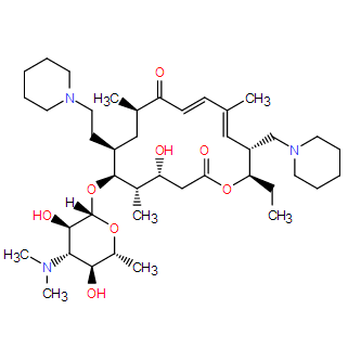 Smiles O=C(/C=C/C(C)=C/[C@H](CN1CCCCC1)[C@@H](CC)O2)[C@H](C)C[C@H](CCN3CCCCC3)[C@H](OC4[C@@H](O)[C@@H](N(C)C)[C@H](O)[C@H](C)O4)[C@@H](C)[C@H](O)CC2=O