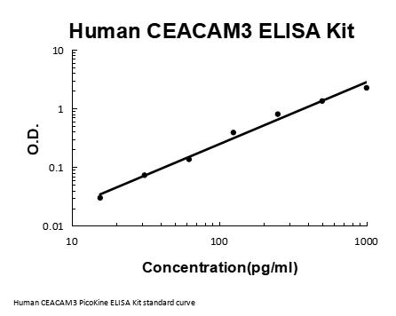 Human CEACAM3 ELISA Kit PicoKine® (96 Tests). Quantitate Human CEACAM3 in cell culture supernatants, serum and plasma (heparin, EDTA). Sensitivity: 10 pg/ml. The brand Picokine indicates this is a premium quality ELISA kit. Each Picokine kit delivers precise quantification, high sensitivity, and excellent reproducibility. Only our most reliable and effective kits qualify as Picokine, guaranteeing top-tier results for your assays.