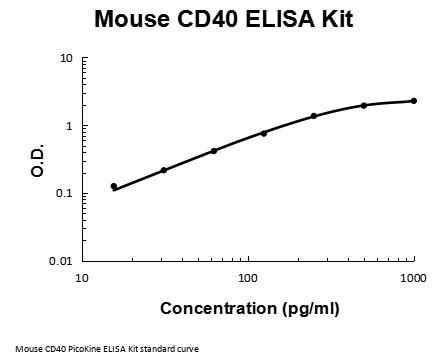 Mouse CD40/TNFRSF5 PicoKine® Quick ELISA Kit (90 minutes, 96 Tests). Quantitate Mouse CD40/TNFRSF5 in cell culture supernatants, cell lysates, serum and plasma (heparin, EDTA). Sensitivity: 1 pg/ml. The brand Picokine indicates this is a premium quality ELISA kit. Each Picokine kit delivers precise quantification, high sensitivity, and excellent reproducibility. Only our most reliable and effective kits qualify as Picokine, guaranteeing top-tier results for your assays.