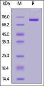 This protein carries a polyhistidine tag at the N-terminus. The protein has a calculated MW of 91.5 kDa. The protein migrates as 80-100 kDa under reducing (R) condition (SDS-PAGE) due to glycosylation.