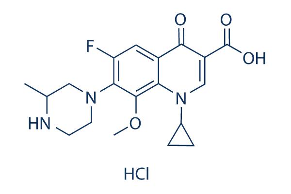 Gatifloxacin (AM-1155, CG5501, BMS-206584, PD135432) hydrochloride is a potent fluoroquinolone antibiotic with broad-spectrum antibacterial activity. Gatifloxacin hydrochloride inhibits bacterial type II topoisomerases with IC50 of 13.8 μg/ml and 0.109 μg/ml for S. aureus topoisomerase IV and E. coli DNA gyrase, respectively.