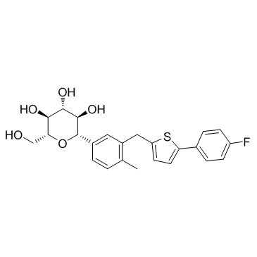 Canagliflozin (JNJ 28431754) is a selective SGLT2 inhibitor with IC50s of 2 nM, 3.7 nM, and 4.4 nM for mSGLT2, rSGLT2, and hSGLT2 in CHOK cells, respectively[1].