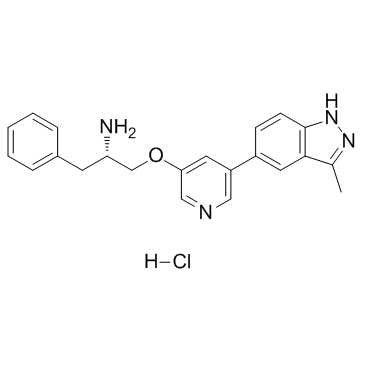 Smiles N[C@@H](CC1=CC=CC=C1)COC2=CC(C3=CC4=C(C=C3)NN=C4C)=CN=C2.[H]Cl
