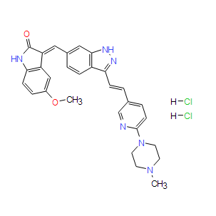 Smiles CN1CCN(CC1)C2=NC=C(C=C2)/C=C/C3=NNC4=C3C=CC(=C4)/C=C/5\C6=C(C=CC(=C6)OC)NC5=O.Cl.Cl