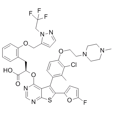 Smiles CC(C(Cl)=C(OCCN1CCN(C)CC1)C=C2)=[C@@]2[C@]3=C(C4=CC=C(F)O4)SC5=NC=NC(O[C@H](CC6=C(OCC7=CC=NN7CC(F)(F)F)C=CC=C6)C(O)=O)=C53