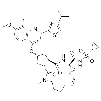 Simeprevir (TMC 435350) is a potent inhibitor of HCV NS3/4A protease (Ki = 0.36 nM) and viral replication (replicon EC50 = 7.8 nM).