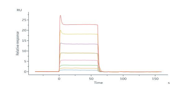 This protein carries a twin streptavidin tag at the C-terminus. The protein has a calculated MW of 23.7 kDa. The protein migrates as 30-40 kDa under reducing (R) condition (SDS-PAGE) due to glycosylation.