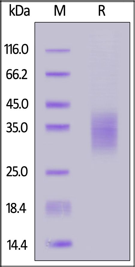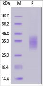 This protein carries an Avi tag (Avitag™) at the C-terminus, followed by a polyhistidine tag. The protein has a calculated MW of 21.8 kDa. The protein migrates as 30-40 kDa under reducing (R) condition (SDS-PAGE) due to glycosylation.