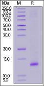 This protein carries a polyhistidine tag at the C-terminus. The protein has a calculated MW of 8.7 kDa. The protein migrates as 13 kDa under reducing (R) condition (SDS-PAGE) due to glycosylation.