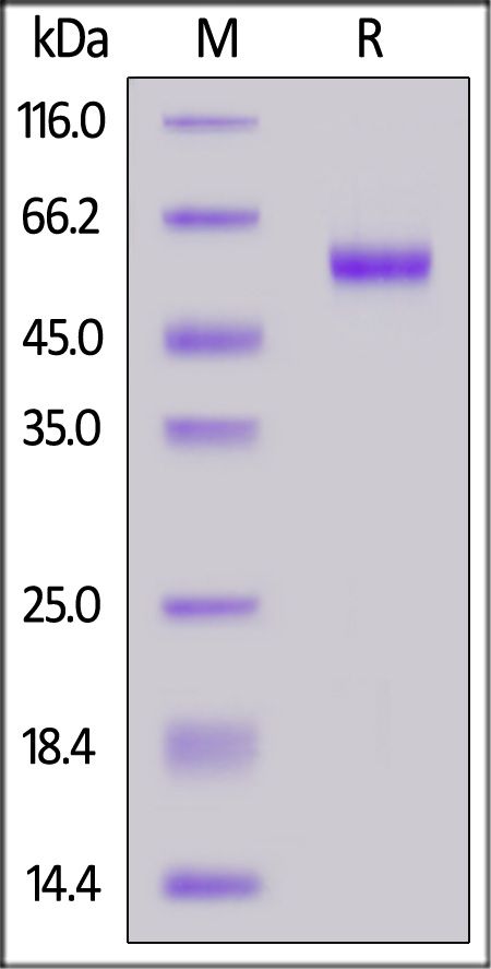 This protein carries a human IgG1 Fc tag at the C-terminus, followed by an Avi tag (Avitag™). The protein has a calculated MW of 45.4 kDa. The protein migrates as 55-60 kDa under reducing (R) condition (SDS-PAGE) due to glycosylation.