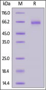This protein carries a polyhistidine tag at the C-terminus. The protein has a calculated MW of 55.3 kDa. The protein migrates as 65-70 kDa under reducing (R) condition (SDS-PAGE) due to glycosylation.
