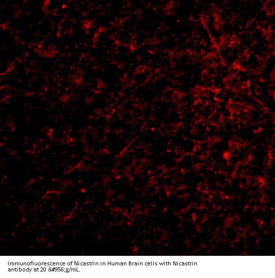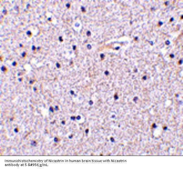 Nicastrin antibody was raised against a 17 amino acid synthetic peptide from near the carboxy terminus of human Nicastrin. The immunogen is located within amino acids 630 - 680 of Nicastrin.