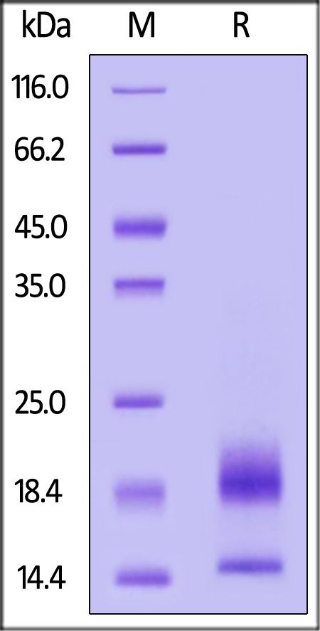 This protein carries a polyhistidine tag at the C-terminus. The protein has a calculated MW of 10.8 kDa. The protein migrates as 14 kDa and 18-20 kDa under reducing (R) condition (SDS-PAGE) due to glycosylation.