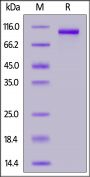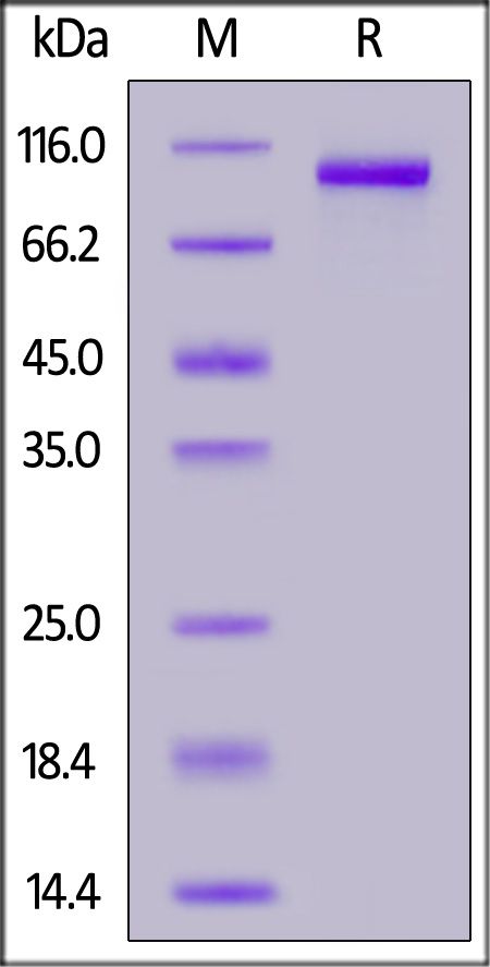 This protein carries a human IgG1 Fc tag at the C-terminus. The protein has a calculated MW of 81.5 kDa. The protein migrates as 100-115 kDa when calibrated against Star Ribbon Pre-stained Protein Marker under reducing (R) condition (SDS-PAGE) due to glycosylation.
