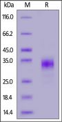 This protein carries a polyhistidine tag at the C-terminus, followed by an Avi tag (Avitag™). The protein has a calculated MW of 23.9 kDa. The protein migrates as 30-34 kDa when calibrated against Star Ribbon Pre-stained Protein Marker under reducing (R) condition (SDS-PAGE) due to glycosylation.