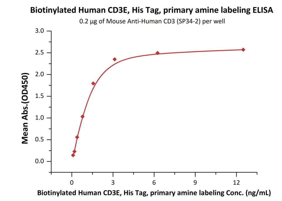 MABSol® Biotinylated Human CD3E, His Tag, primary amine labeling (CDE-H8224) is expressed from human HEK293 cells. It contains AA Asp 23 - Asp 126 (Accession # NP_000724.1).