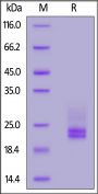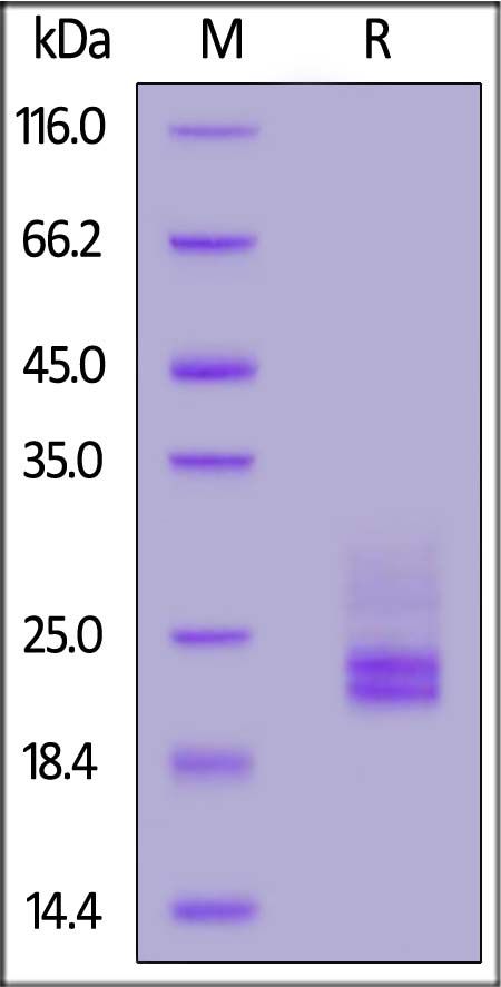 Biotinylated Human CD3E&CD3G Heterodimer Protein, His, Avitag&Tag Free is produced by co-expression of CD3E and CD3G, has a calculated MW of 18.6 kDa (CD3E) and 14.7 kDa (CD3G). Subunit CD3E is fused with a polyhistidine tag at the C-terminus, followed by an Avi tag and subunit CD3G contains no tag at the C-terminus. The reducing (R) heterodimer protein migrates as 20-24 kDa and 25-28 kDa when calibrated against Star Ribbon Pre-stained Protein Marker due to glycosylation.