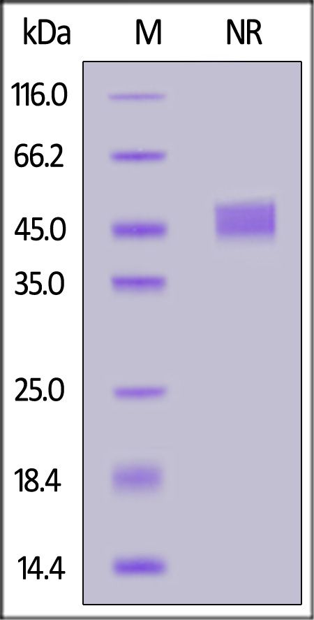 This protein carries a polyhistidine tag at the N-terminus, followed by a flag tag. The protein has a calculated MW of 50.5 kDa. The protein migrates as 45-55 kDa under non-reducing (NR) condition (SDS-PAGE) due to glycosylation.