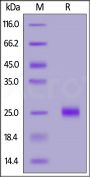 This protein carries a polyhistidine tag at the N-terminus, followed by an Avi tag (Avitag™). The protein has a calculated MW of 19.6 kDa. The protein migrates as 24-27 kDa under reducing (R) condition (SDS-PAGE) due to glycosylation.