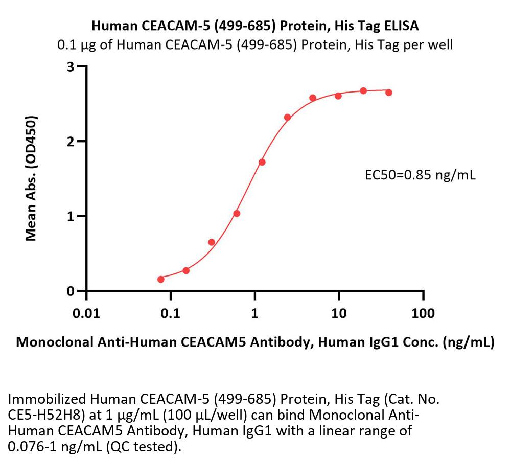 Carcinoembryonic antigen-related cell adhesion molecule 5 (CEACAM5) is also Carcinoembryonic antigen (CEA), Meconium antigen 100, CD antigen CD66e, CEACAM5 belongs to the immunoglobulin superfamily and CEA family. CEACAM5 contains seven Ig-like (immunoglobulin-like) domains. CEACAM5 is homodimer protein which binding of E.coli Dr adhesins leads to dissociation of the homodimer. CEACAM5 is cell surface glycoprotein that plays a role in cell adhesion and in intracellular signaling.