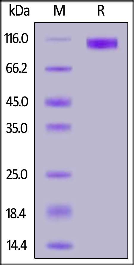 This protein carries a polyhistidine tag at the C-terminus. The protein has a calculated MW of 79.6 kDa. The protein migrates as 90-120 kDa under reducing (R) condition (SDS-PAGE) due to glycosylation.