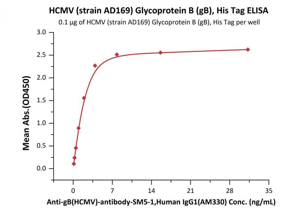 HCMV Glycoprotein B (gB) Protein (Strain AD169), His Tag is the ectodomain of HCMV (strain AD169) glycoprotein B (gB) which contains AA Ser 25 - Phe 706 (Accession # P06473 (Y155G, I156H, Y157R, Y206H, W240A, L241T, Y242H, R456S, R459S)). The recombinant protein is expressed from human 293 cells (HEK293) with a polyhistidine tag at the C-terminus. Mutations Y155G, I156H, Y157R, Y206H, W240A, L241T, Y242H and R456S, R459S are introduced to stabilize the trimeric postfusion state of HCMV gB protein and abolish the furin cleavage site, respectively.