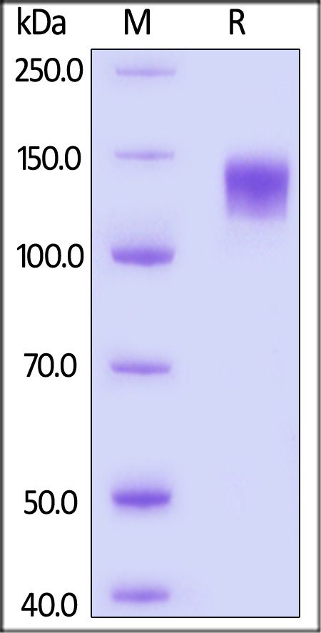 This protein carries a polyhistidine tag at the C-terminus. The protein has a calculated MW of 78.7 kDa. The protein migrates as 110-140 kDa when calibrated against Star Ribbon Pre-stained Protein Marker under reducing (R) condition (SDS-PAGE) due to glycosylation.