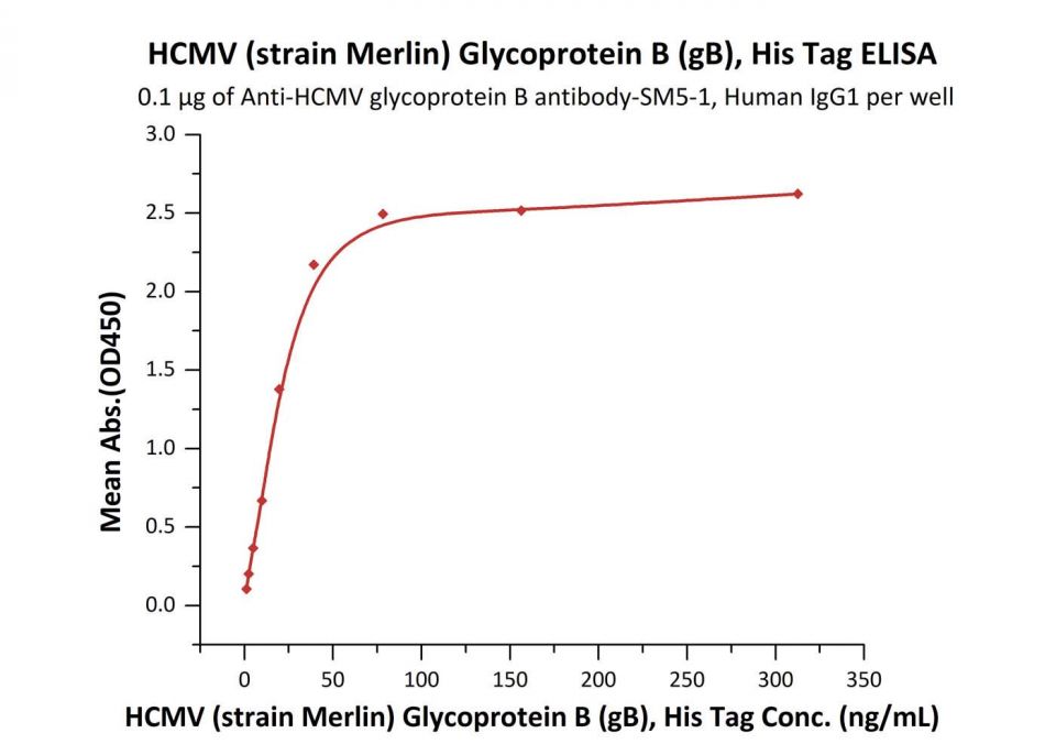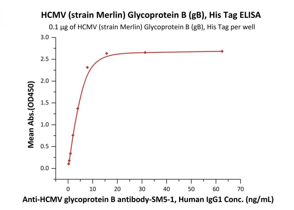 Human cytomegalovirus is a species of the Cytomegalovirus genus of viruses, which in turn is a member of the viral family known as Herpesviridae or herpesviruses. It is typically abbreviated as HCMV or, commonly but more ambiguously, as CMV. CMV Virus Envelope Glycoportein B (CMV-GB) can be cleaved into glycoprotein GP55. Envelope glycoprotein that plays a role in host cell entry, cell to-cell virus transmission, and fusion of infected cells. CMV-GB may be involved in the initial attachment via binding to heparan sulfate together with the gM/gN complex that binds heparin with higher affinity. Furthermore, CMV-GB can interact with host integrin ITGB1, PDGFRA and EGFR that likely serve as postattachment entry receptors. Also, CMV-GB participates in the fusion of viral and cellular membranes leading to virus entry into the host cell. Membrane fusion is mediated by the fusion machinery composed at least of gB and the heterodimer gH/gL.