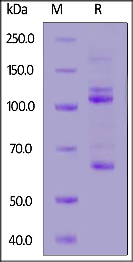 This protein carries a polyhistidine tag at the C-terminus. The protein has a calculated MW of 186.1 kDa. The protein migrates as 70 kDa, 100-120 kDa and 160-180 kDa under reducing (R) condition (SDS-PAGE) due to glycosylation.
