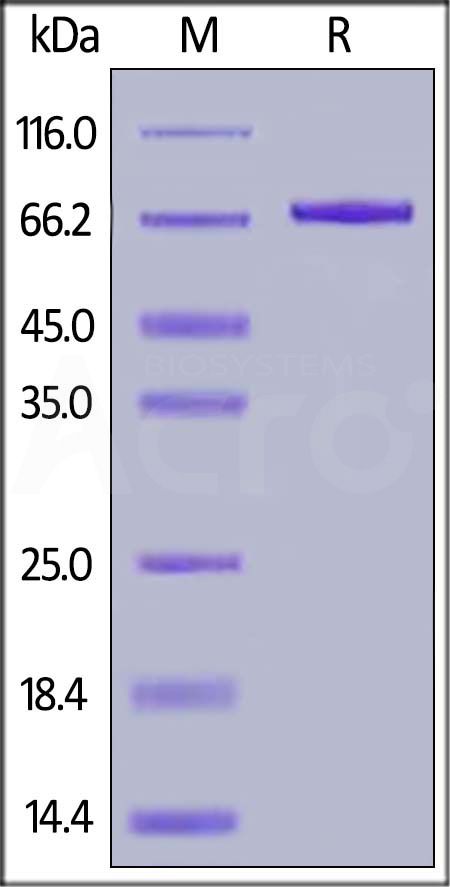 This protein carries a polyhistidine tag at the C-terminus, followed by an Avi tag (Avitag™). The protein has a calculated MW of 69.7 kDa. The protein migrates as 70 kDa under reducing (R) condition (SDS-PAGE) due to glycosylation.