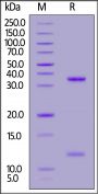Biotinylated Rabbit FCGRT&B2M Heterodimer Protein, His, Avitag&Tag Free, produced by co-expression of FCGRT and B2M, has a calculated MW of 33.8 kDa (FCGRT) & 11.7 kDa (B2M). Subunit FCGRT is fused with a polyhistidine tag at the C-terminus, followed by an Avi tag (Avitag™) and subunit Beta-2 microglobulin (B2M) contains no tag at the C-terminus. The reducing (R) protein migrates as 35-40 kDa (FCGRT) & 12 kDa (B2M) respectively due to glycosylation.