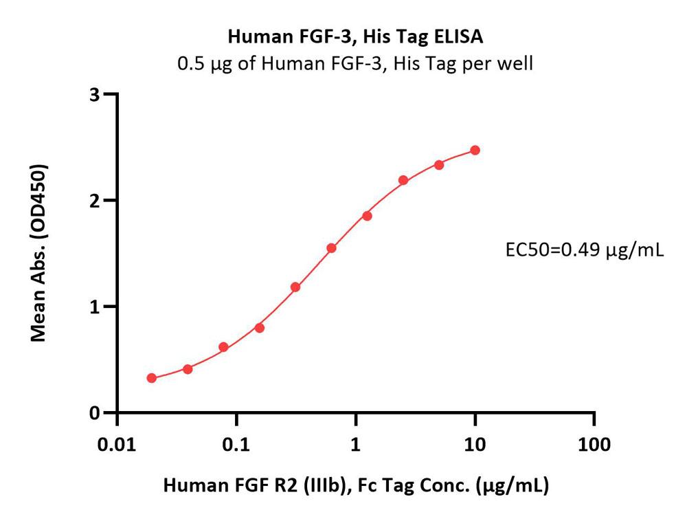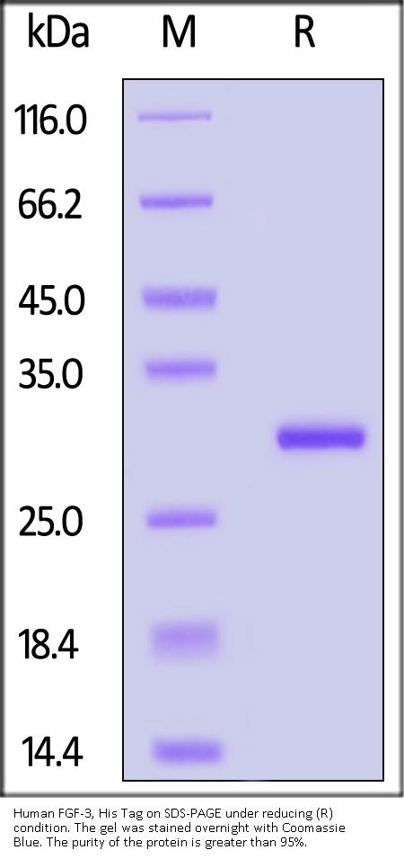 Human FGF-3, His Tag (FG3-H51H9) is expressed from E. coli cells. It contains AA Ala 18 - His 239 (Accession # P11487-1).