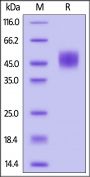 This protein carries a polyhistidine tag at the C-terminus. The protein has a calculated MW of 25.9 kDa. The protein migrates as 42-55 kDa under reducing (R) condition (SDS-PAGE) due to glycosylation.