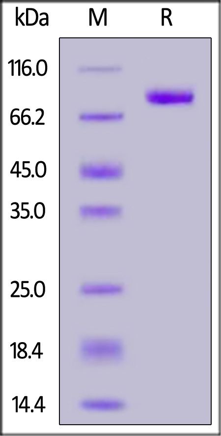 This protein carries a human IgG1 Fc tag at the C-terminus. The protein has a calculated MW of 65.0 kDa. The protein migrates as 80-90 kDa under reducing (R) condition (SDS-PAGE) due to glycosylation.