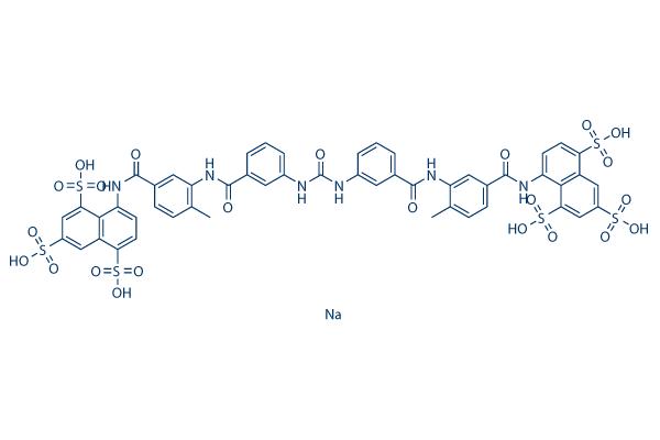 Suramin sodium salt (Suramin hexasodium salt) is a reversible and competitive protein-tyrosine phosphatase (PTPases) inhibitor, also is the potent inhibitor of sirtuins, purified topoisomerase II and SARS-CoV-2 RNA-dependent RNA polymerase (RdRp).