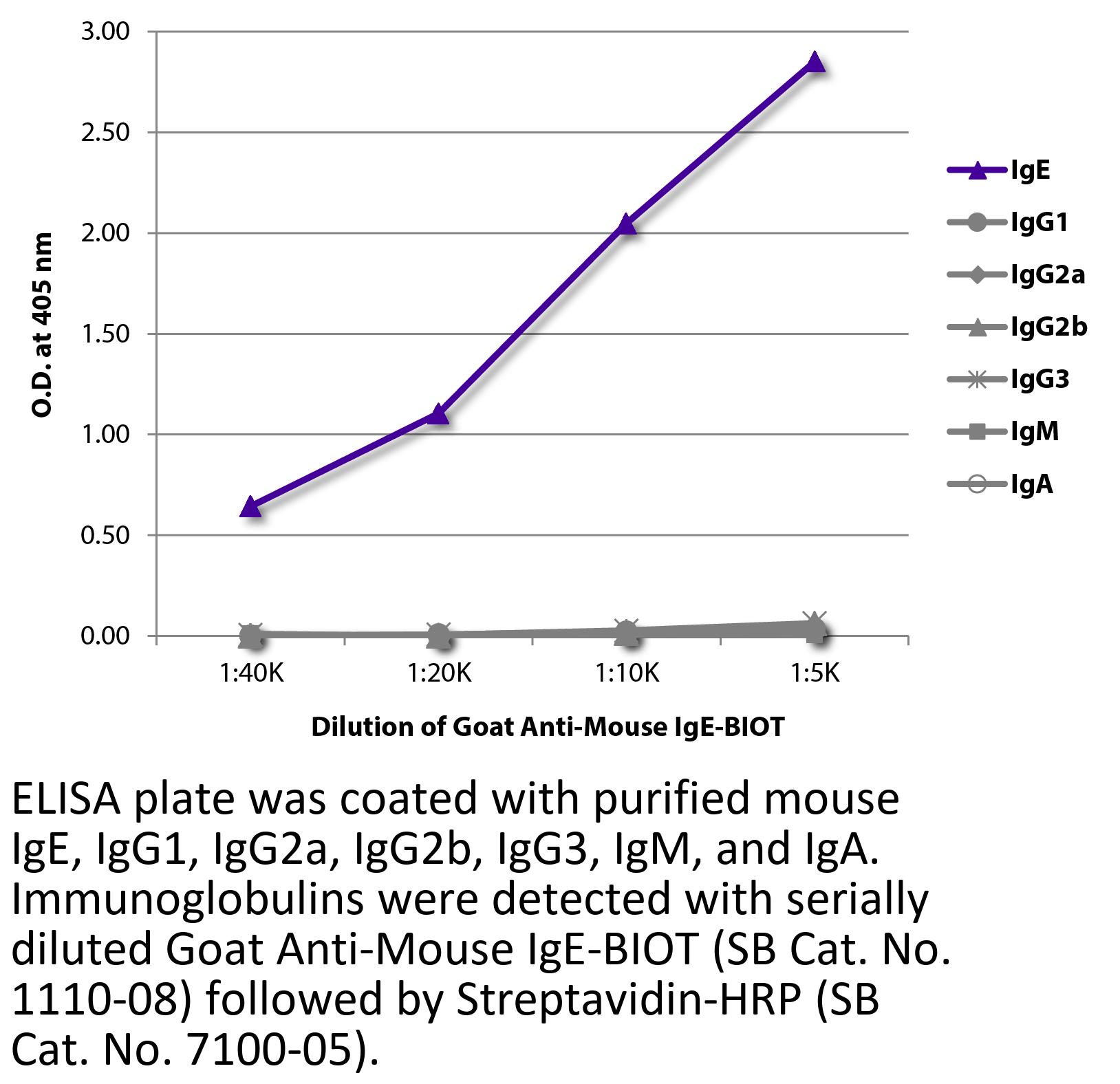 Goat Anti-Mouse IgE-Biotin antibody for use in ELISA, flow cytometry, immunocytochemistry, western blot, and immunoprecipitation assays.
