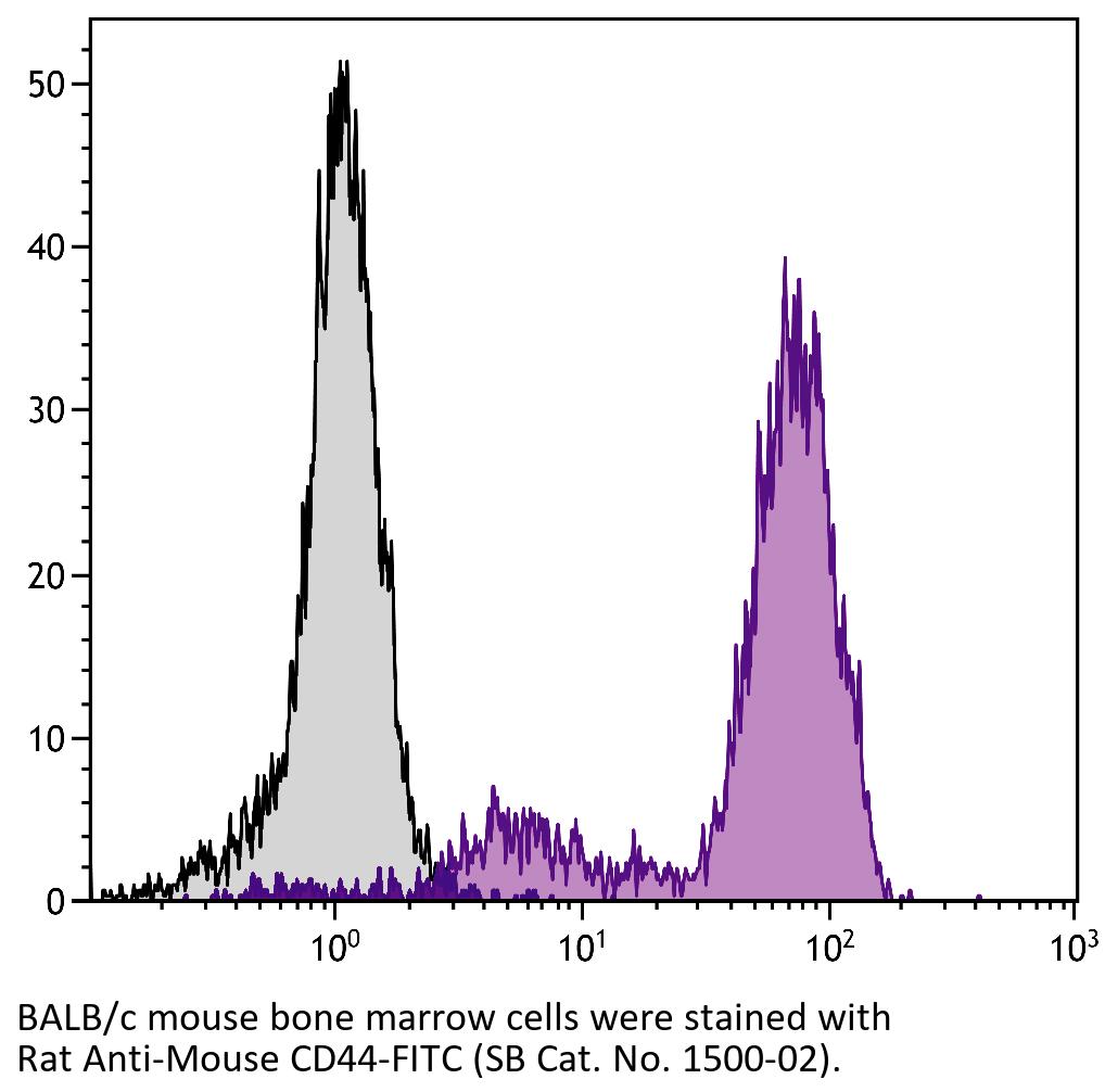 CD44 represents a family of type I transmembrane glycoproteins expressed on many cell types such as B cells, monocytes, macrophages, and variable subsets of thymocytes and peripheral T cells. CD44 primarily functions as an adhesion molecule. It has been implicated in various processes, such as hematopoiesis, lymphocyte homing, leukocyte activation, tumor metastasis and development. The KM201 monoclonal antibody reacts with an epitope very close to the hyaluronate binding domain on the CD44 molecule. KM201 can inhibit hyaluronate-dependent cell aggregation, prevent lympho-hemopoiesis in both Dexter and Whitlock-Witte cultures, prevent the earliest intrathymic precursors from homing to the thymus, and costimulate the activation of freshly purified splenic CD4+ T cells.