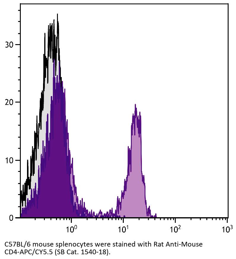 CD4 is a type I transmembrane glycoprotein expressed on most thymocytes and the helper/inducer subpopulation of mature T lymphocytes of all mouse strains tested. CD4 has also been detected at low density on pluripotent hematopoietic stem cells, bone marrow myeloid precursors, and intrathymic lymphoid precursors. The CD4 antigen functions as a co-receptor, interacting with class II major histocompatability complex (MHC) molecules in the recognition of foreign antigens by T cells. In vivo and in vitro treatment with the GK1.5 monoclonal antibody effectively depletes CD4+ cells. GK1.5 also blocks helper T cell responses to MHC class II antigens, including cytolysis, proliferation, allogeneic B cell help, and release of lymphokines.