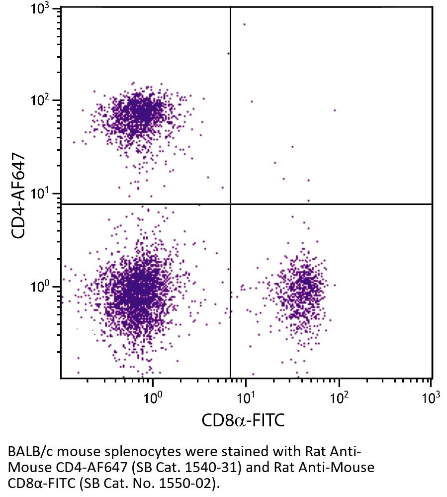 CD4 is a type I transmembrane glycoprotein expressed on most thymocytes and the helper/inducer subpopulation of mature T lymphocytes of all mouse strains tested. CD4 has also been detected at low density on pluripotent hematopoietic stem cells, bone marrow myeloid precursors, and intrathymic lymphoid precursors. The CD4 antigen functions as a co-receptor, interacting with class II major histocompatability complex (MHC) molecules in the recognition of foreign antigens by T cells. In vivo and in vitro treatment with the GK1.5 monoclonal antibody effectively depletes CD4+ cells. GK1.5 also blocks helper T cell responses to MHC class II antigens, including cytolysis, proliferation, allogeneic B cell help, and release of lymphokines.