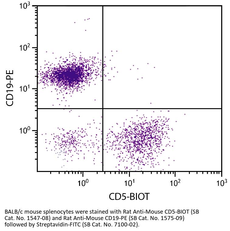 CD5, also known as Lyt-1, is a monomeric type I transmembrane glycoprotein expressed on thymocytes, T lymphocytes, and a subset of B lymphocytes, but not on natural killer (NK) cells. It has been identified as the major ligand of the B-cell antigen CD72. The frequency of CD5+ B cells exhibits strain-dependent variation, and the phenotypic, anatomical, functional, developmental, and pathological characteristics of the CD5+ B cells suggest that they may represent a distinct lineage, known as B-1 cells. Binding of CD5 on the T cell surface can augment alloantigen- or mitogen-induced lymphocyte proliferation and induces increased cytosolic free calcium, IL-2 secretion, and IL-2R expression. It has been proposed that CD5 negatively regulates signal transduction mediated by the T-cell and B-cell receptors.