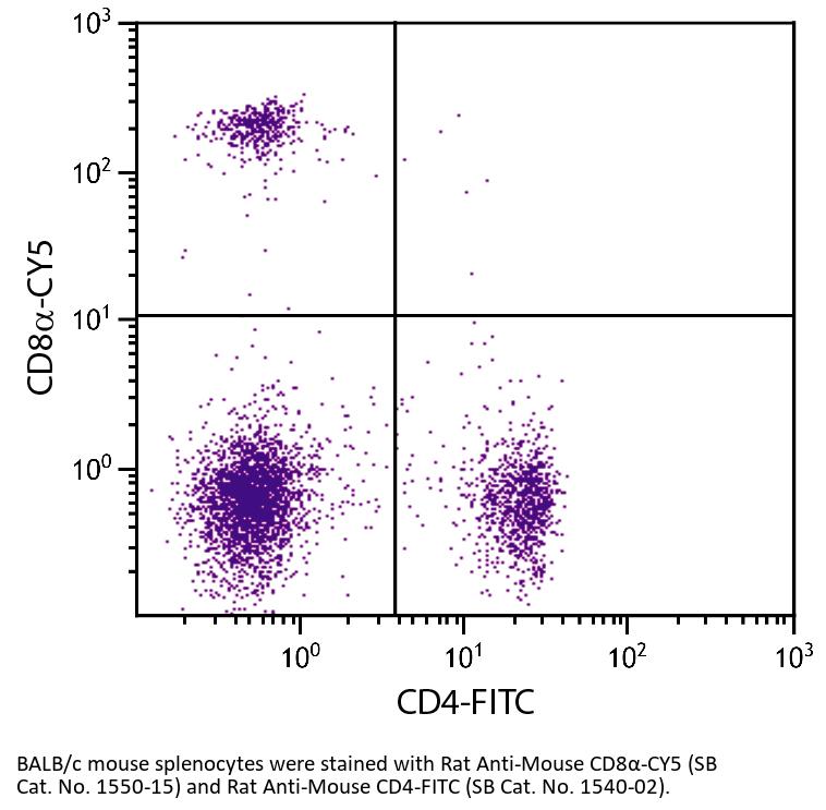 In the mouse, CD8 exists in two forms – (i) a CD8 heterodimer composed of an α chain (CD8α) and a β chain (CD8β); and (ii) a homodimer of two α chains. The heterodimer is found on the surface of essentially all thymocytes and the “suppressor/cytotoxic” subpopulation of mature T lymphocytes. Subsets of intestinal intraepithelial lymphocytes express CD8α without CD8β. It has been suggested that CD8+β- T cells mature extrathymically, while development of the CD8α+β+ population of T cells is thymus-dependent. CD8 acts as a coreceptor with MHC Class I-restricted T cell receptors in antigen recognition and positive selection of MHC class I-restricted CD8+ T cells. In vivo and in vitro treatment with the 53-6.7 monoclonal antibody effectively depletes CD8α+ cells. The 53-6.7 monoclonal antibody also blocks allogeneic help specific for class I MHC antigens and T cell responses to IL-2.