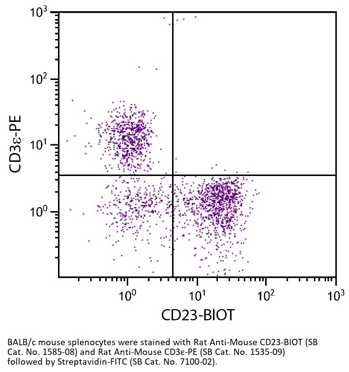 The CD23 antigen is the low affinity IgE Fc receptor, which is a 45-49 kDa protein with 38 and 28 kDa fragments. It is expressed on most mature, conventional B cells (but not on peritoneal CD5+ B cells) and can also be found on the surface of T cells, macrophages and platelets. It is distinct from the high affinity IgE receptors found on basophils and mast cells which mediate allergic reactions. The low affinity receptors are thought to play a role in isotype specific immunoregulation. The regulation of CD23 surface expression appears to be integral with the complex IgE system which involves interactions of cells, cytokines, antibodies and regulatory factors. CD23 has been described as a “membrane bound cytokine, " in that the soluble cleavage products of CD23 are themselves able to act as cytokines in vitro.